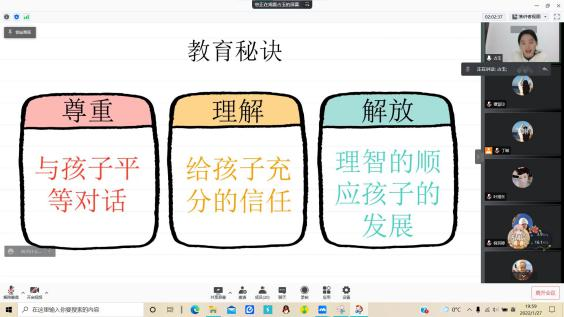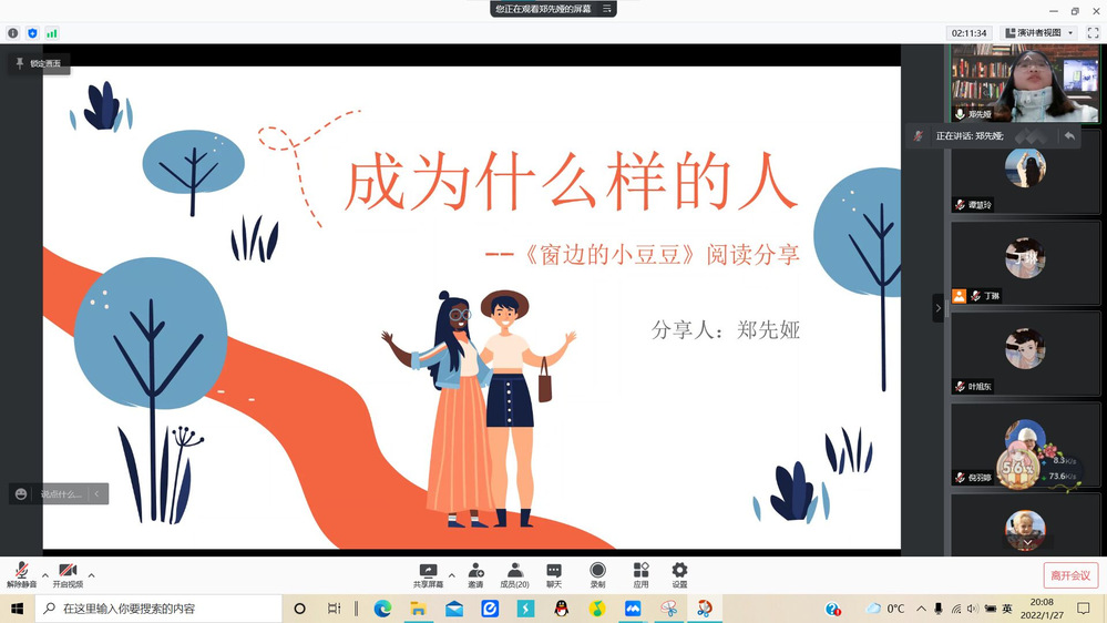 2022年1月27日晚七时,第十二届行知班训练营第四营共读《窗边的小豆豆》线上分享会顺利举行。本次分享会由第四营指导老师丁琳主持,武汉小学文化大道分校校长熊春萍出席会议,行知训练营第四营助教老师谭娇娇和四营全体营员参加。