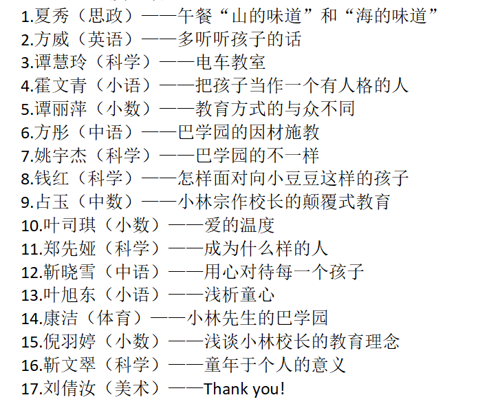 霍文青同学从《放回原处》这一章分享了把孩子当做有人格的人;钱红同学分享了我们应该怎么应对像小豆豆这样的孩子;康洁同学分享了小林先生的巴学园;而面对小豆豆这样的孩子,靳文翠同学则从小豆豆妈妈和小林先生的做法,为我们分享了童年于个人的意义……同学们对于这本书皆有着自己独特感受,所有营员分享主题及顺序如下: