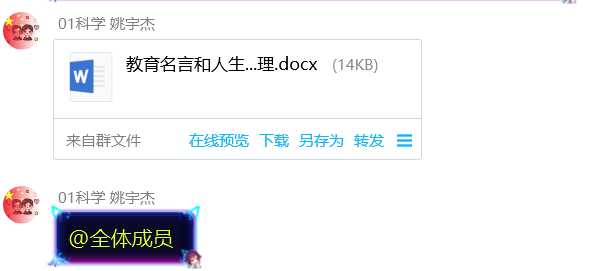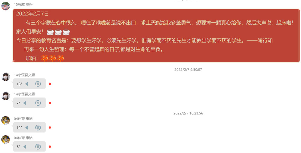 名言警句,言简意赅,寓意深邃。诵读起来,朗朗上口。如亲耳聆听着名师高人的教诲,是鞭策、鼓舞人奋发向上的座右铭,教育名言更可以陶冶情操、开阔眼界,也可以增长智慧、学习语言,还可以提高阅读和写作的能力。因此,为了提高第四营营员理解语言、积累语言和运用语言的综合素养,更广泛地学习教育名言和人生哲理,营员姚宇杰带领大家于1月23日开展“学以治之,思以精之”第四营教育名言学习活动,营长丁琳老师和助教谭姣姣老师均积极支持。此次活动于2月20日结束,从开始到结束共29天,中间没有间断,营员按照顺序每日由一名同学分享自己喜欢的一句教育名言和一句励志名言,同时发诵读语音到训练群,其他营员也需要发送诵读语音到群内,经过一段时间的积累,活动取得了一定的成效。其具体流程如下: