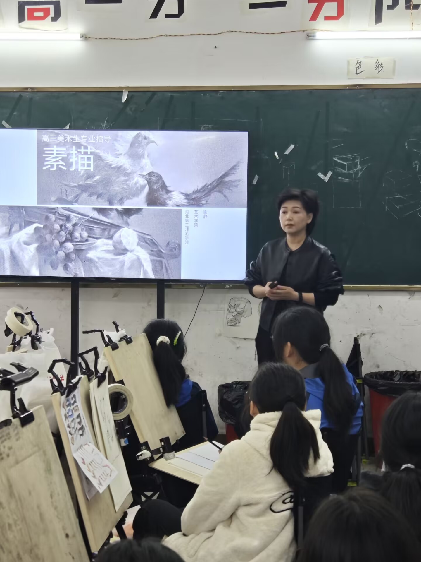 美术课上,谢静副教授对高二美术专业学生进行素描指导,素描石膏像指导。谢静副教授亲自讲解与示范,讲解细致,生动有趣,得到我校老师和学生的一致好评。